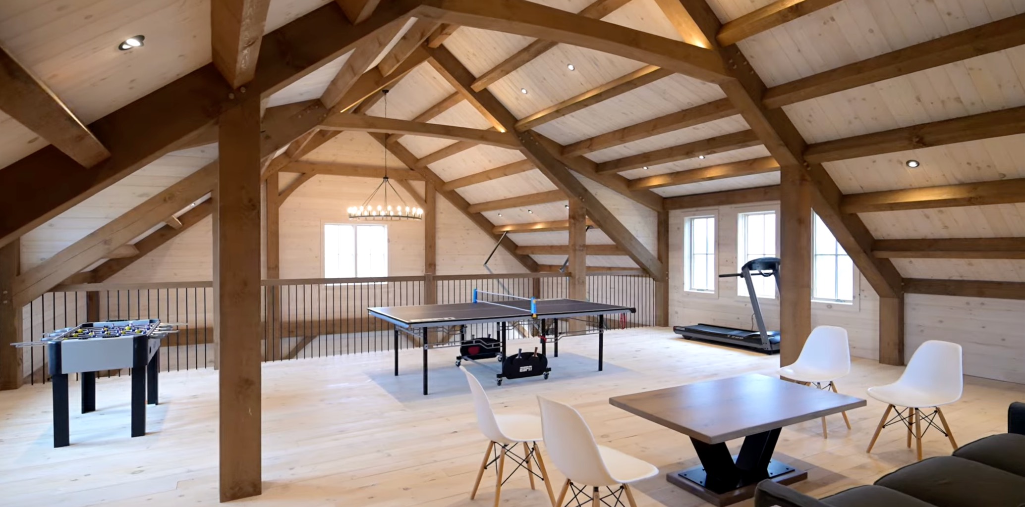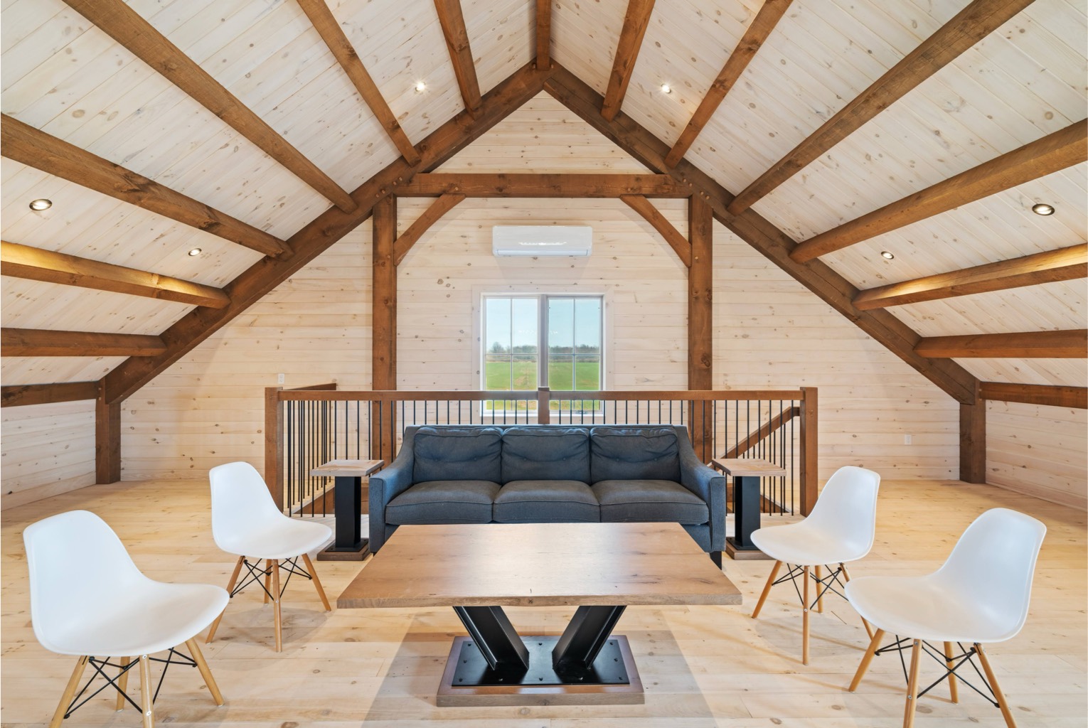 The exposed beams and joinery immediately set the tone. Every post, brace, and beam is structural, creating a sense of openness and strength that conventional framing cannot replicate. The warmth of the timber contrasts naturally with the light wood finishes, allowing the loft to feel bright, calm, and welcoming rather than secondary or hidden.